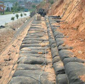 Made by polyester (PET) or polypropylene (PP) fiber as the raw material, making double sides ironed and pressed needle-punched non-woven geotextile through the spun bonded technology, and then processed to bag with specified dimension, fill soil, sand and fertilizer etc. padding into bag according to local soil conditions and scientific proportion, and then spray seeds which are suitable for local climate, form a new product which could restore or create a new ecosystem.